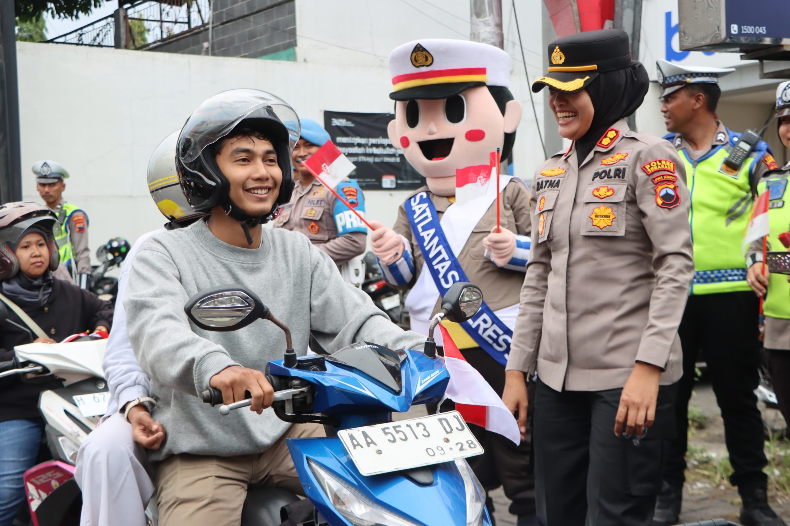 Dengan senyum, sapa dan salam, nampak AKBP Ratna beserta personel Polres Semarang membagikan bendera gratis kepada pengguna jalan, baik roda dua maupum roda empat.