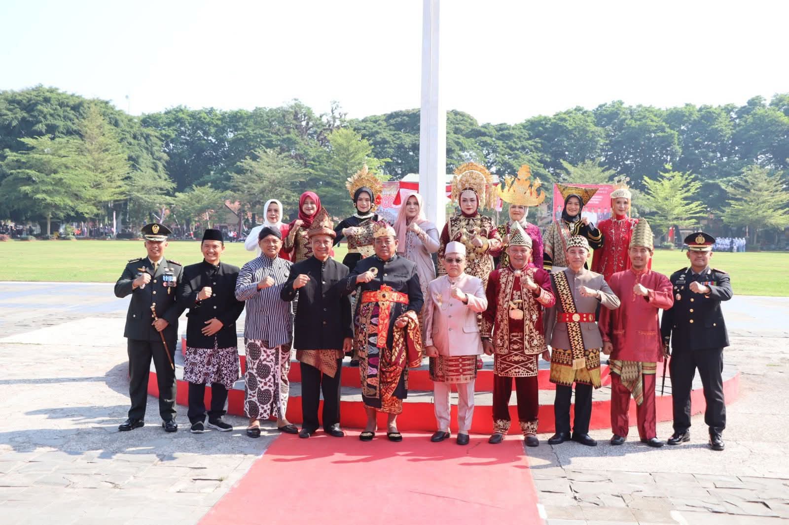 Bupati Grobogan yang didampingi Wakil Bupati Sugeng Prasetyo dan Sekda Grobogan Anang Armunanto mengenakan pakaian adat Indonesia.